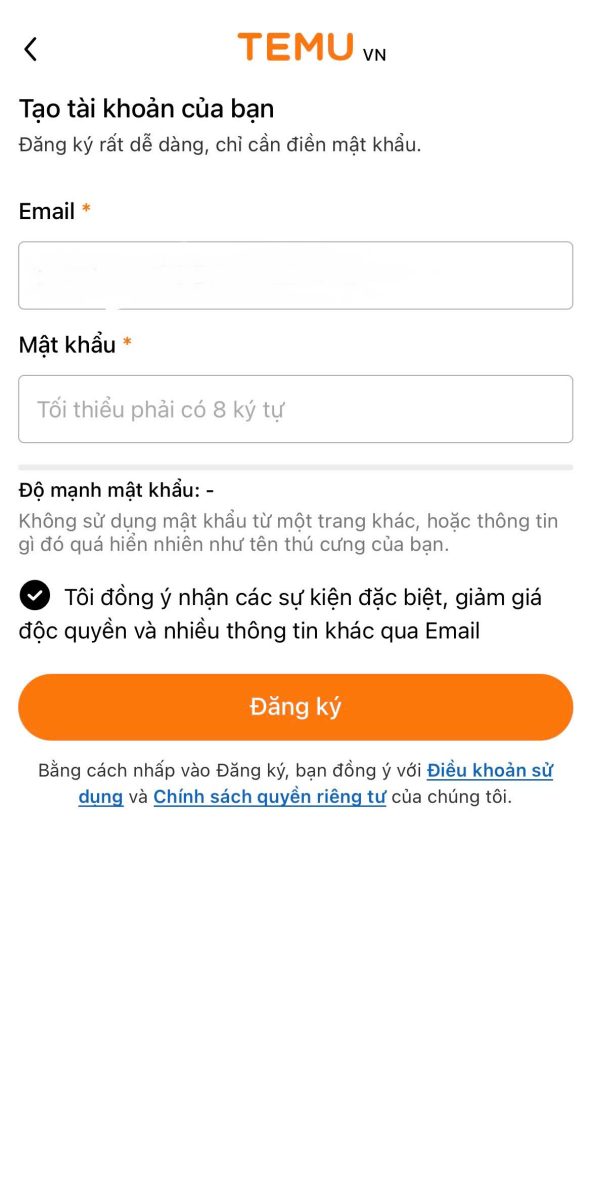 - Bước 5: Nhập mật khẩu và nhấn Đăng ký để hoàn tất việc tạo tài khoản trên ứng dụng Temu.